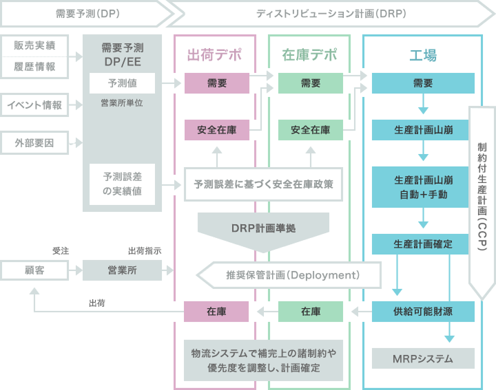 原料・資材の調達から製品の製造、最終顧客への供給までのモノの流れと情報の流れを最適化し管理することで、適正な在庫水準、販売機会のロス、リードタイム短縮等の戦略的な経営をサポートするためのシステム導入をご提供致します。