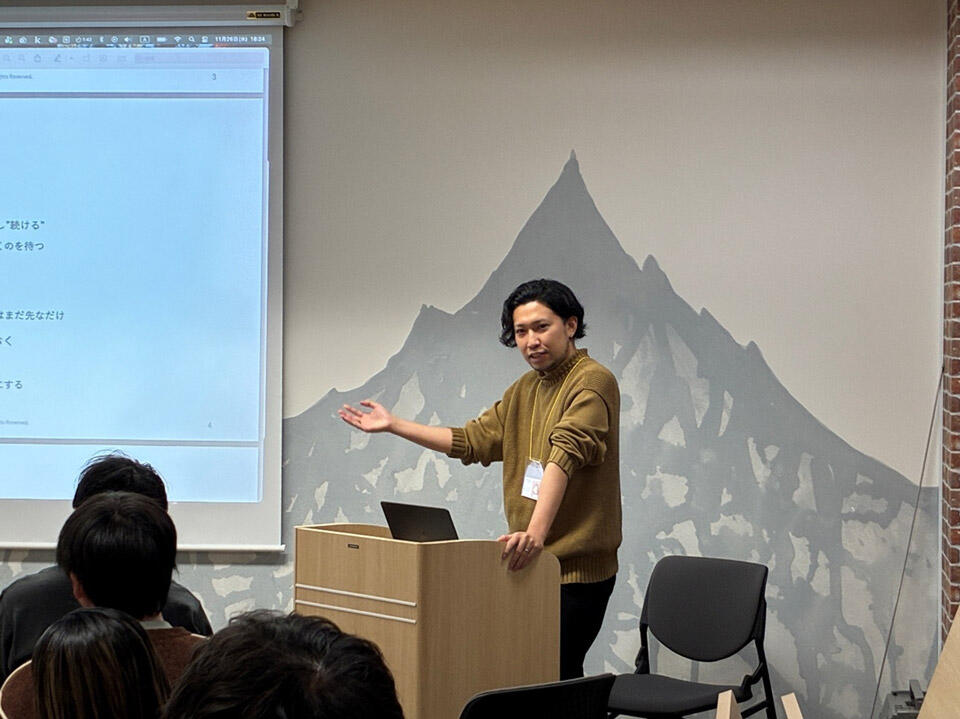 イベントの前半はLT(ライトニングトーク)。各社のリーダー・中堅層の方々に発表をお願いし、当社からはシステム研究開発センター所属の武藤 真弘が「育つ場を耕しています」というテーマで登壇。『育成とは「育てる」ではなく「育つ場を耕す」こと』について発表しました。