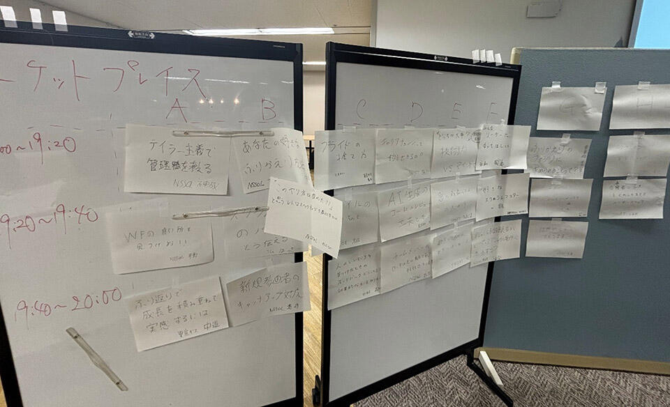 イベント後半はOSTです。最初はマーケットプレイス(議題・テーマの一覧)を参加者で作成しましたが、数多くのテーマが提案され、用意していたテーマ貼り付け用のボードを急遽追加するほどでした。最終的に20分×3セットを8トラックで実施することとなりました。