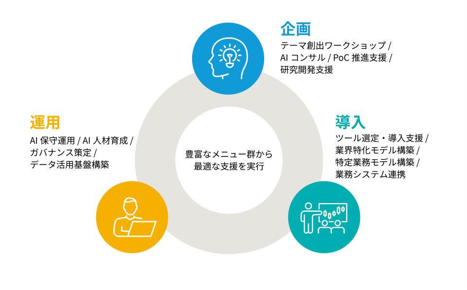 NS Craft AI Factoryは、汎用的な業務プロセスへのAI導入から、業界特有の高度かつ専門的な業務領域におけるAI活用まで幅広く対応し、お客様の変革テーマに合わせて企画・導入・運用の各フェーズにおいて最適な支援を提供し、伴走型で実行いたします。
