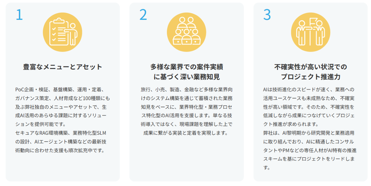 NS Craft AI Factoryは、NSSOLのこれまでの自然言語処理や機械学習領域で培ってきた実績を活用し、企業の業務効率化、顧客対応の高度化、データ分析の自動化など、幅広い分野に対応した豊富なメニューとアセットをもとに、多様な業界での案件実績に基づく深い業務知見とプロジェクト推進力を組み合わせてお客様のビジネス変革を支援するサービスです。新たな顧客体験の提供や、バックオフィス業務プロセス改革など、さまざまなテーマにおける変革を支援します。また、AI活用においては単なる導入にとどまらず、継続的な運用と成果創出が重要となりますが、NSSOLは導入後も継続的に支援を行い、成果が出るまでお客様と伴走し支援いたします。