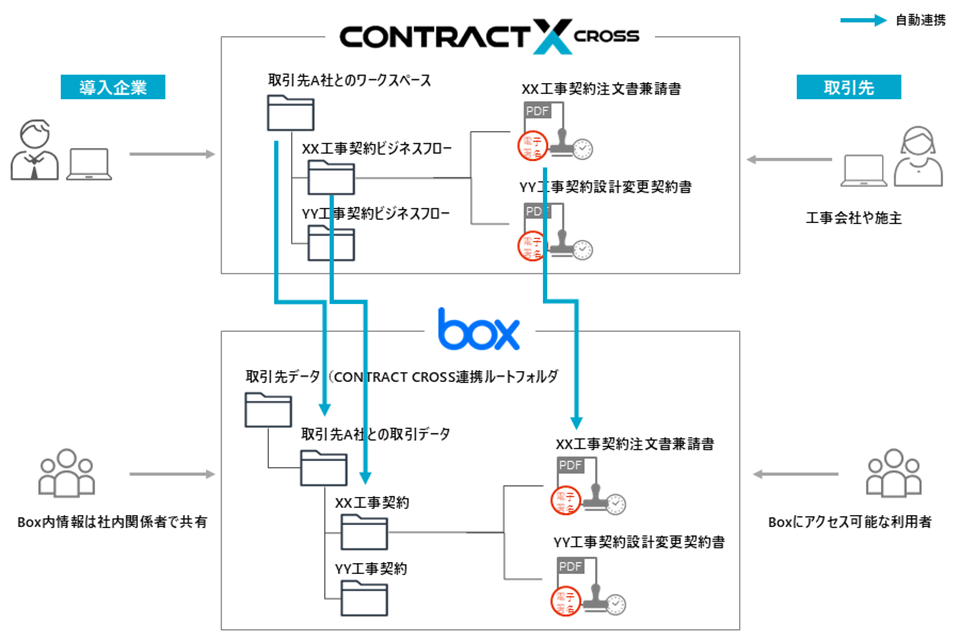 - 安全かつ確実な長期保管が必要な取引文書については、CONTRACT CROSSで管理しながら、情報共有はBoxで行うことができます。