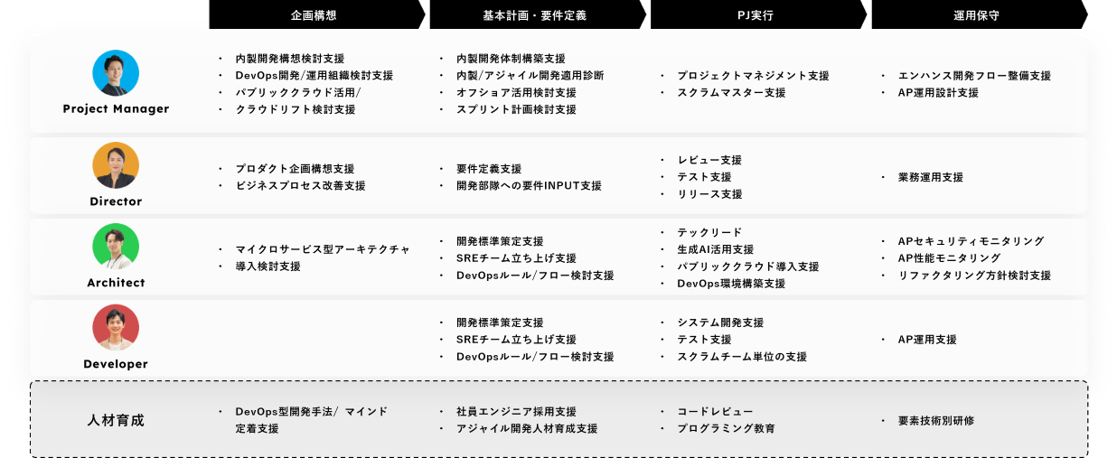 サービス開発においても、プロジェクトを成功に導くためのチーム管理、スコープ管理、品質管理、リスク管理といったプロジェクトマネジメントの実践が不可欠です。NSSOLはシステムインテグレーターとして大規模あるいは高難易度案件を数多く手掛けてきた実績があり、特にスピードと品質の両立が求められるサービス開発においてもプロジェクト実行力を発揮いたします。