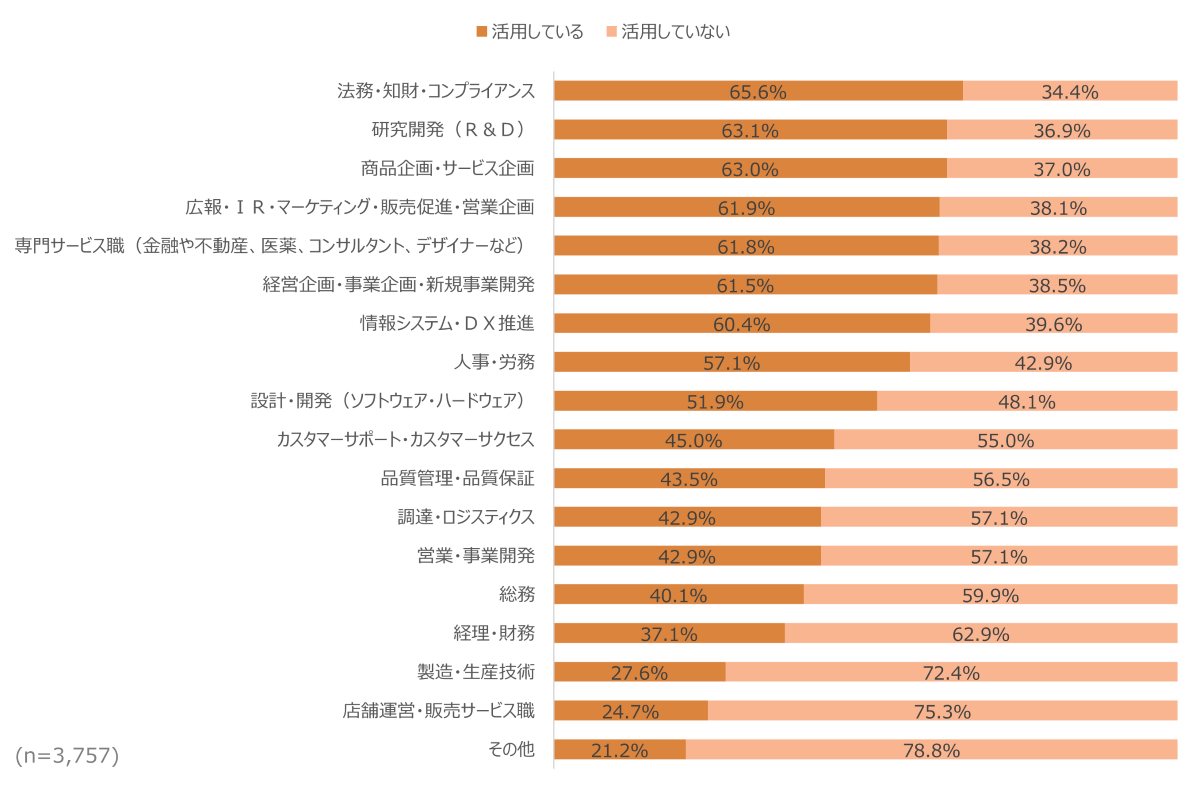 職種別では、企画関連職である「商品企画・サービス企画」「経営企画・事業企画」や、「法務・知財・コンプライアンス」「研究開発(R&D)」といった専門職で高い活用率を示している一方、「製造・生産技術」「店舗運営・販売サービス職」での活用割合は3割に満たない結果となっています。