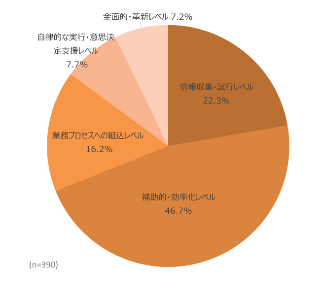業務において生成AIを活用し、生成AI導入の取組等に関与した経験ある方を対象にした調査※2も実施しました。業務における生成AIの活用レベルを見ると、「情報収集・試行」「補助的・効率化」を合わせると約7割を占めており、業務プロセスへの組み込みを実現している企業は2割未満と、全般として活用レベルは高くないことがわかりました。