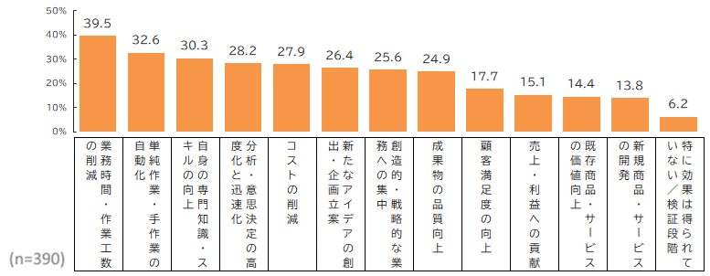 生成AIを活用することについては、約9割がプラス効果を実感していました。得られている効果については「業務時間・作業工数の削減」が約4割で最上位となり、次点に「単純作業・手作業の自動化」が約3割となっており、生成AIは生産性・効率性の向上に活用されていることがわかりました。