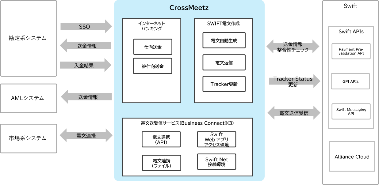 CrossMeetzは、インターネット環境を最大限に活用し、金融機関と顧客双方をつなぐ先進的な「外為総合インターネットサービス」として、顧客受付・ワークフローから決済電文の生成・発信までの一貫処理(STP)、サービス標準でのISO20022※2準拠、行内システムとの柔軟な連携を可能にし、金融機関での効率的な海外送金業務を実現しています。