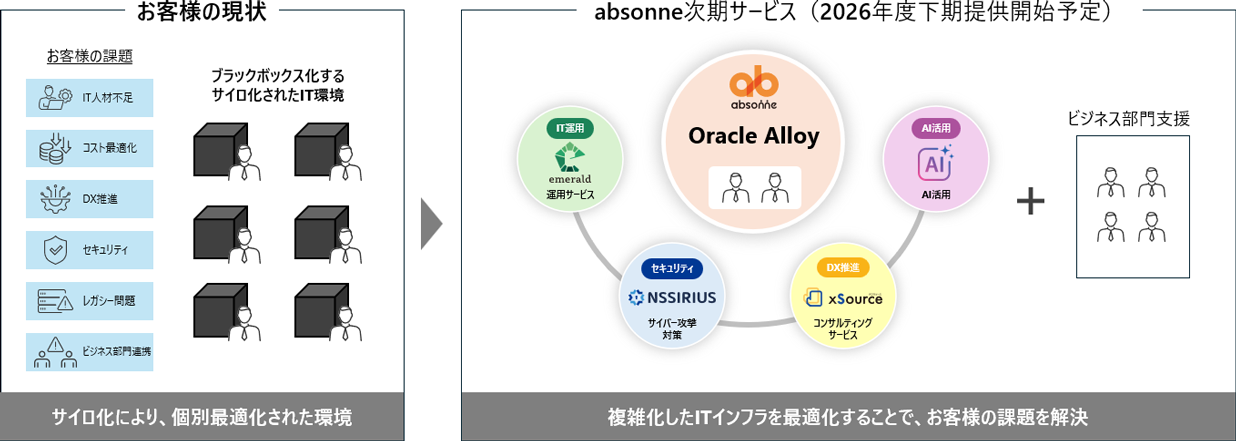 オラクルの包括的なクラウドインフラストラクチャ・プラットフォーム「Oracle Alloy」※1の導入によって刷新される「absonne」の次期サービスでは、「Oracle Cloud Infrastructure(OCI)」が提供する「Oracle AI Database」をはじめとする200以上のクラウドおよびAIサービスを活用することで、日本企業のデータ主権要件に対応し、運用および管理を日本国内で完結できるソブリンクラウド環境をお客様に提供できるようになります。また、NSSOLが強みとする運用サービス「emerald(エメラルド)」※2、サイバー攻撃対策「NSSIRIUS(エヌエスシリウス)」※3、コンサルティングサービス「xSource(クロスソース)」※4などを「Oracle Alloy」に最適化し、オプションメニューとして提供します。